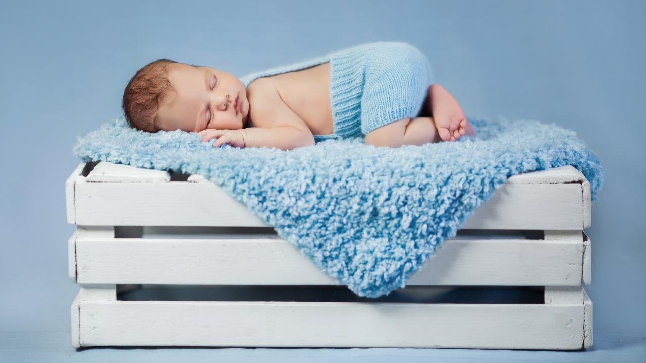 Wallpaper A small baby is sleeping on a blue blanket on a wooden box