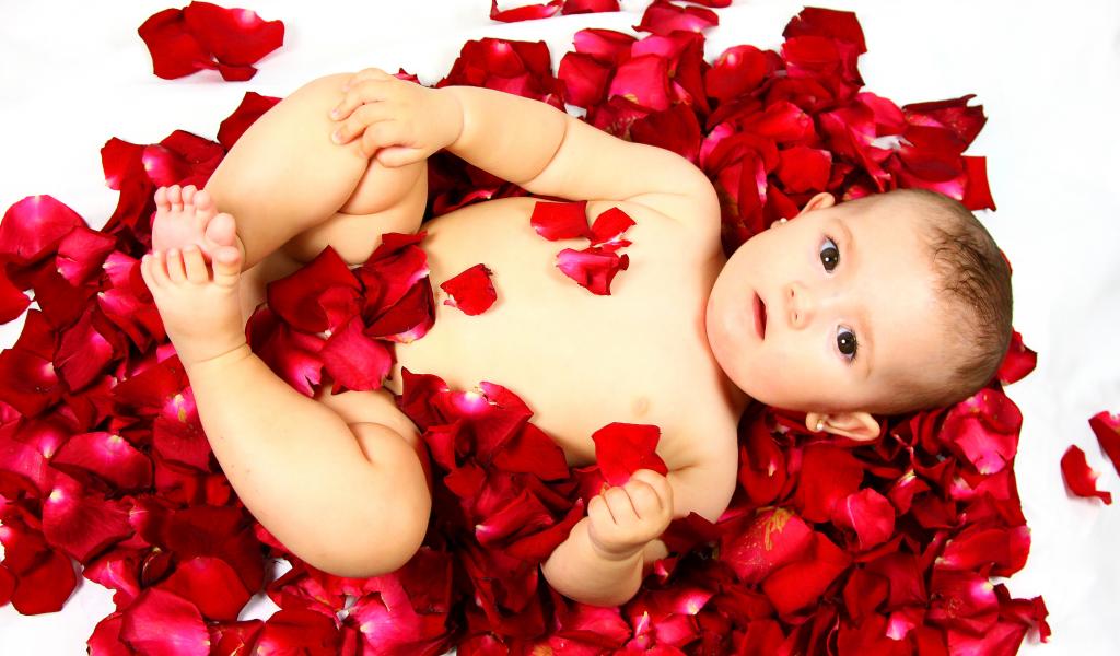 Wallpaper Cute baby lying on rose petals on white background