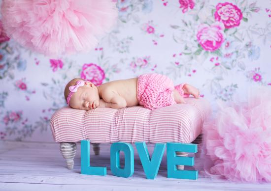 Wallpaper A sleeping baby in a pink suit and the inscription love