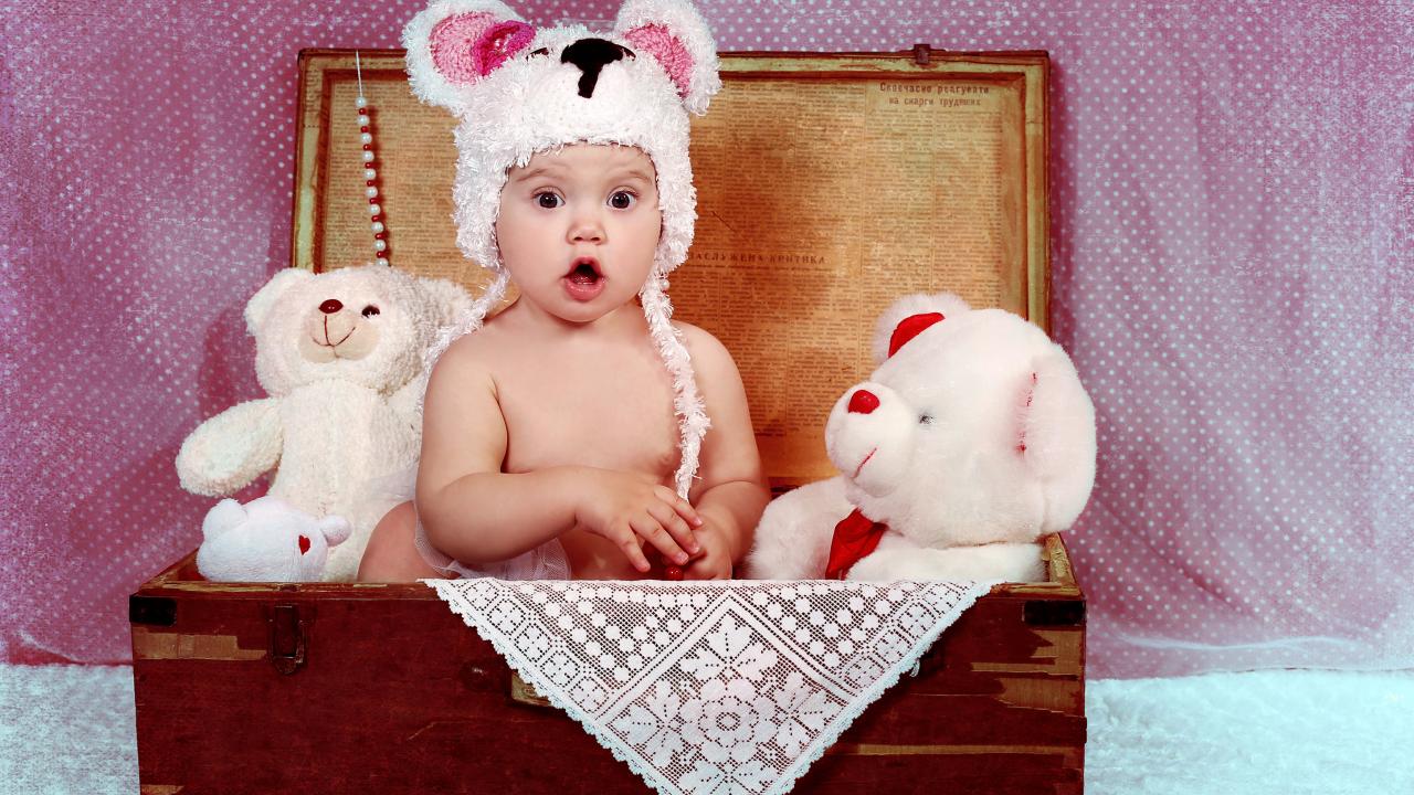 Wallpaper Surprised kid sits in a chest with stuffed toys