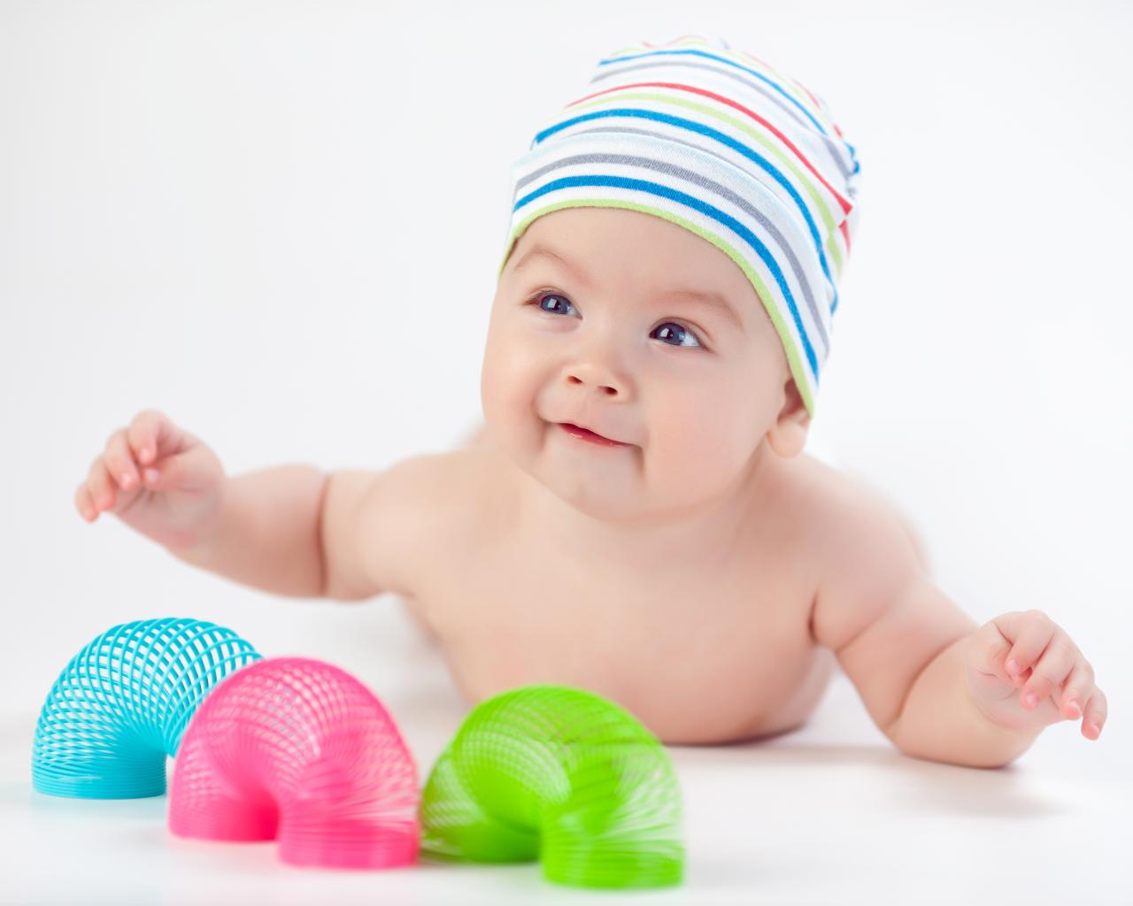 Wallpaper Little baby girl with Christmas toys on a white bedspread