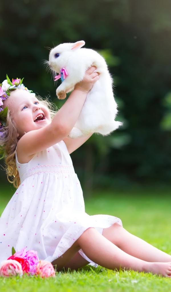 Wallpaper Joyful little girl in white dress with rabbit in hands