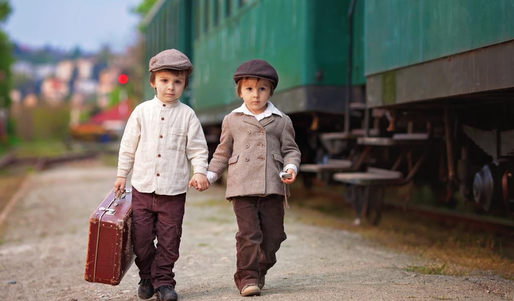 Wallpaper Two little boys with a big suitcase at the train