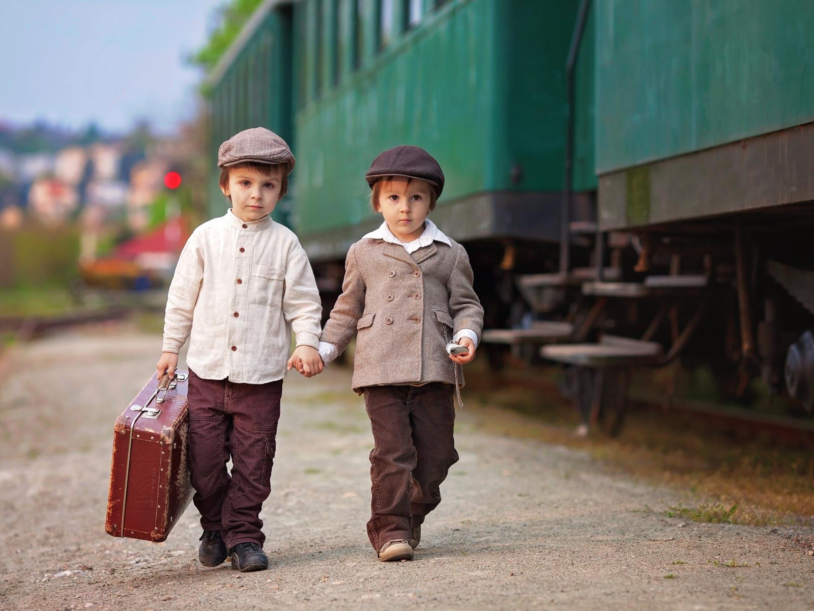 Wallpaper Two little boys with a big suitcase at the train