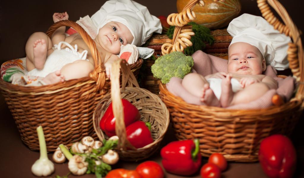 Wallpaper Two babies in chef`s hats lie in baskets with food