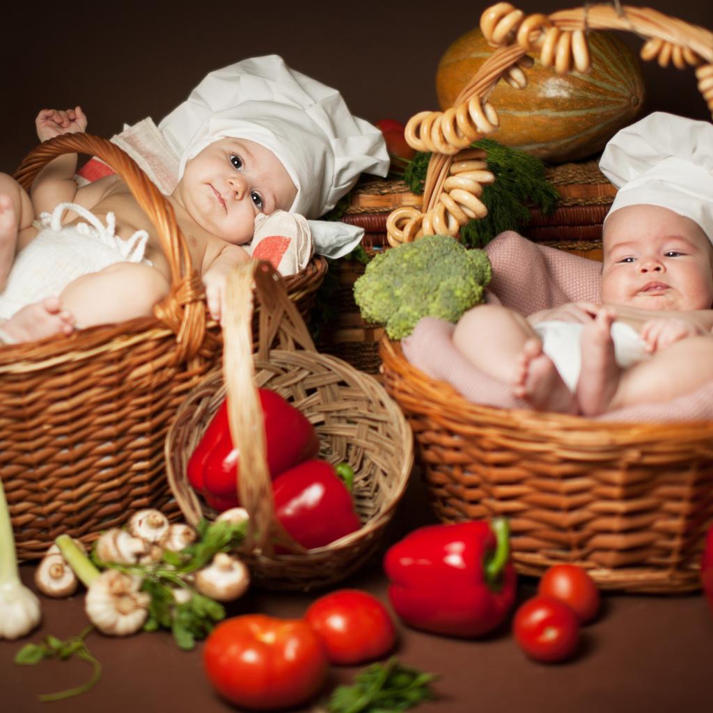 Wallpaper Two babies in chef`s hats lie in baskets with food