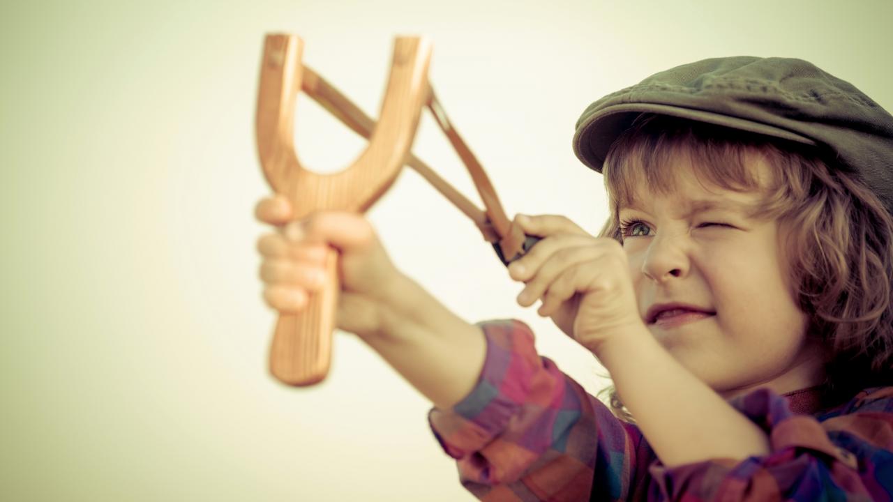 Wallpaper A little boy in a cap aiming with a slingshot