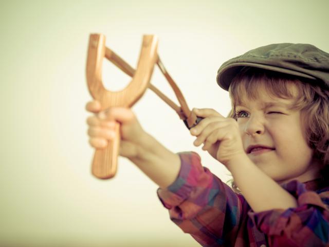 Wallpaper A little boy in a cap aiming with a slingshot