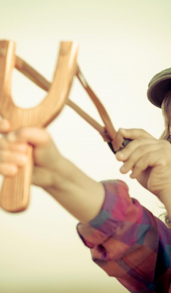 Wallpaper A little boy in a cap aiming with a slingshot
