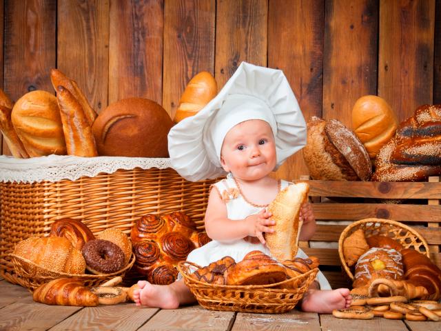 Wallpaper Little boy in a chef suit sits on a table with pastry