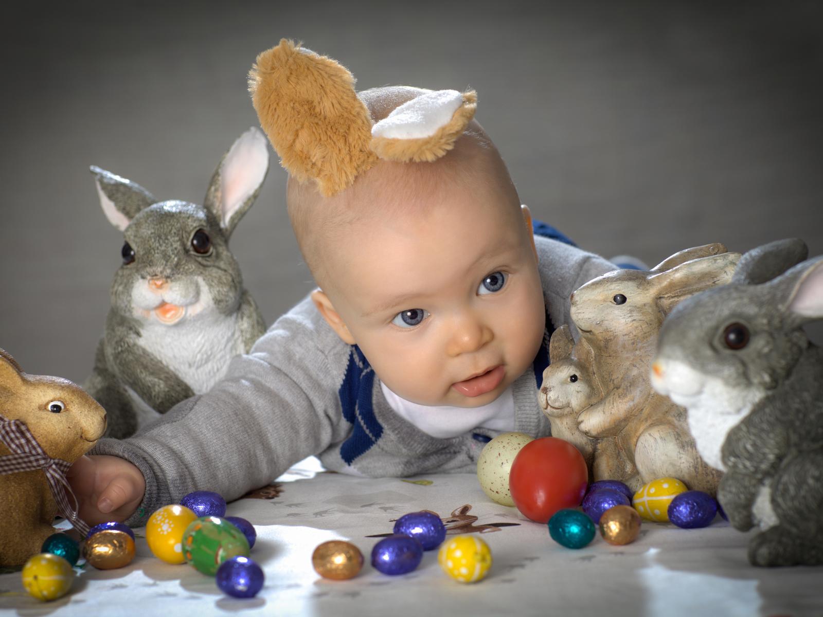 Wallpaper A small child with Easter bunnies and eggs