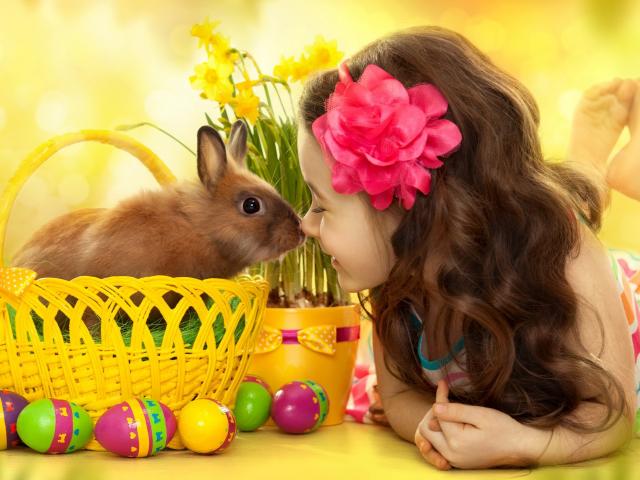 Wallpaper Little girl with a rabbit in a basket on Easter holiday