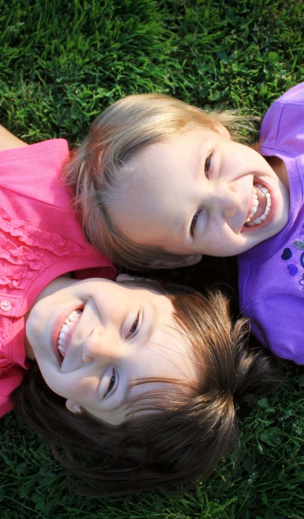 Wallpaper Two little smiling girls lie on the green grass