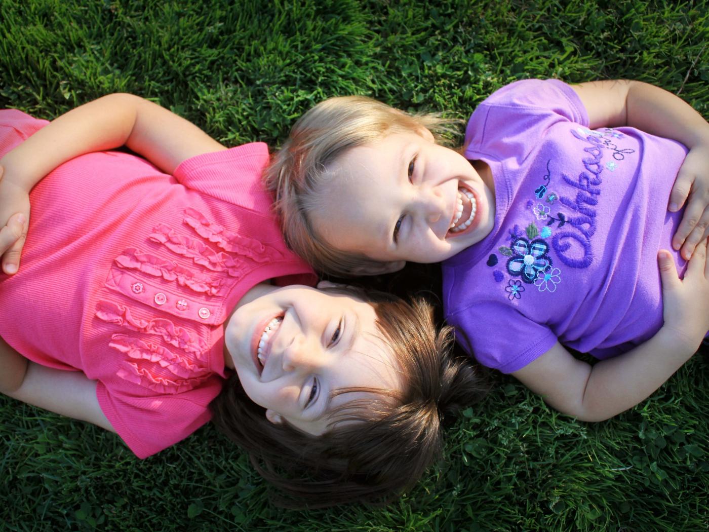 Wallpaper Two little smiling girls lie on the green grass