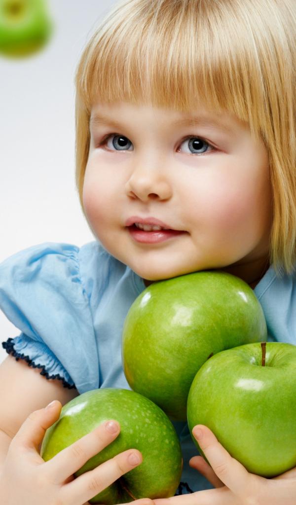 Wallpaper Little blonde girl with green apples