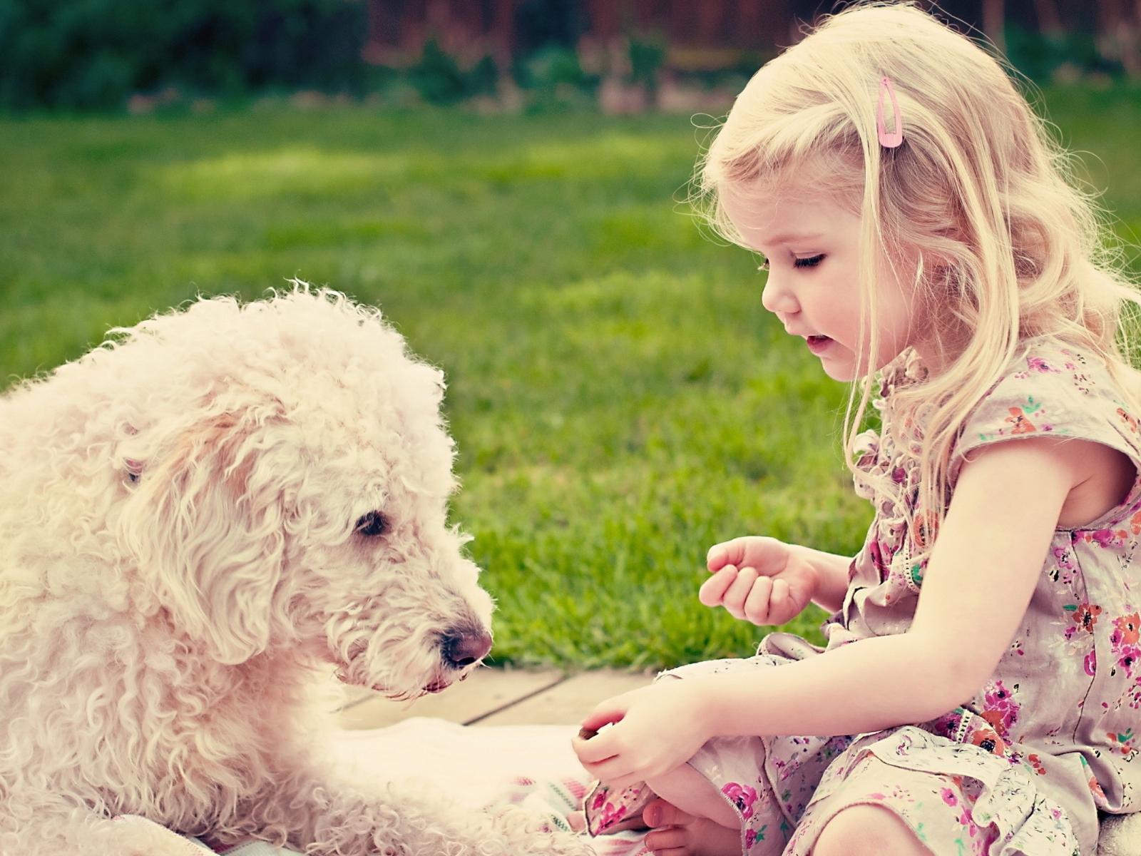 Wallpaper Little girl is playing with a dog on the grass
