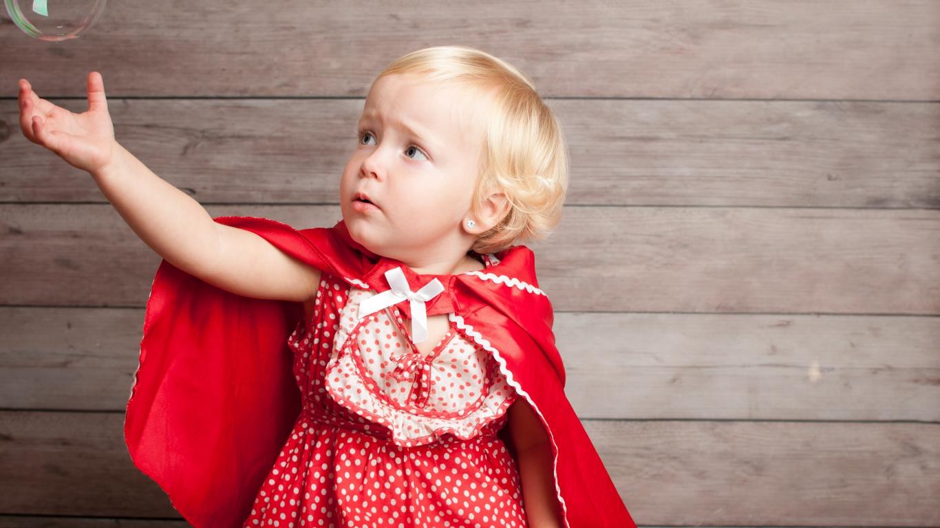Wallpaper Little girl in a red dress is catching a soap bubble