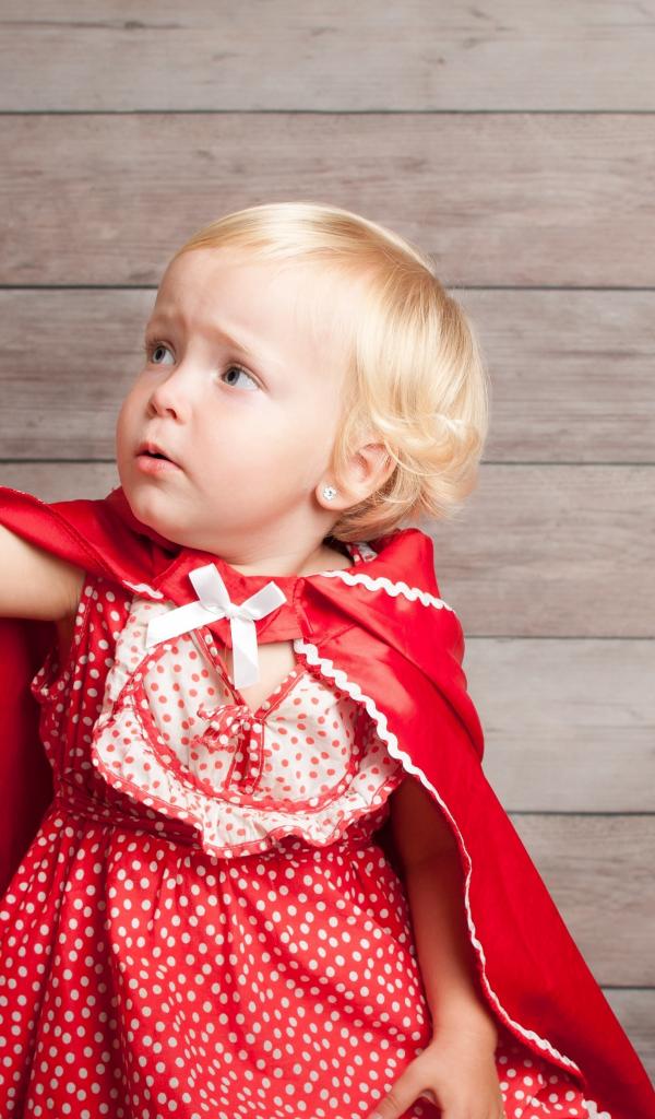 Wallpaper Little girl in a red dress is catching a soap bubble