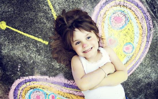 Wallpaper Little girl painted butterfly wings on the asphalt
