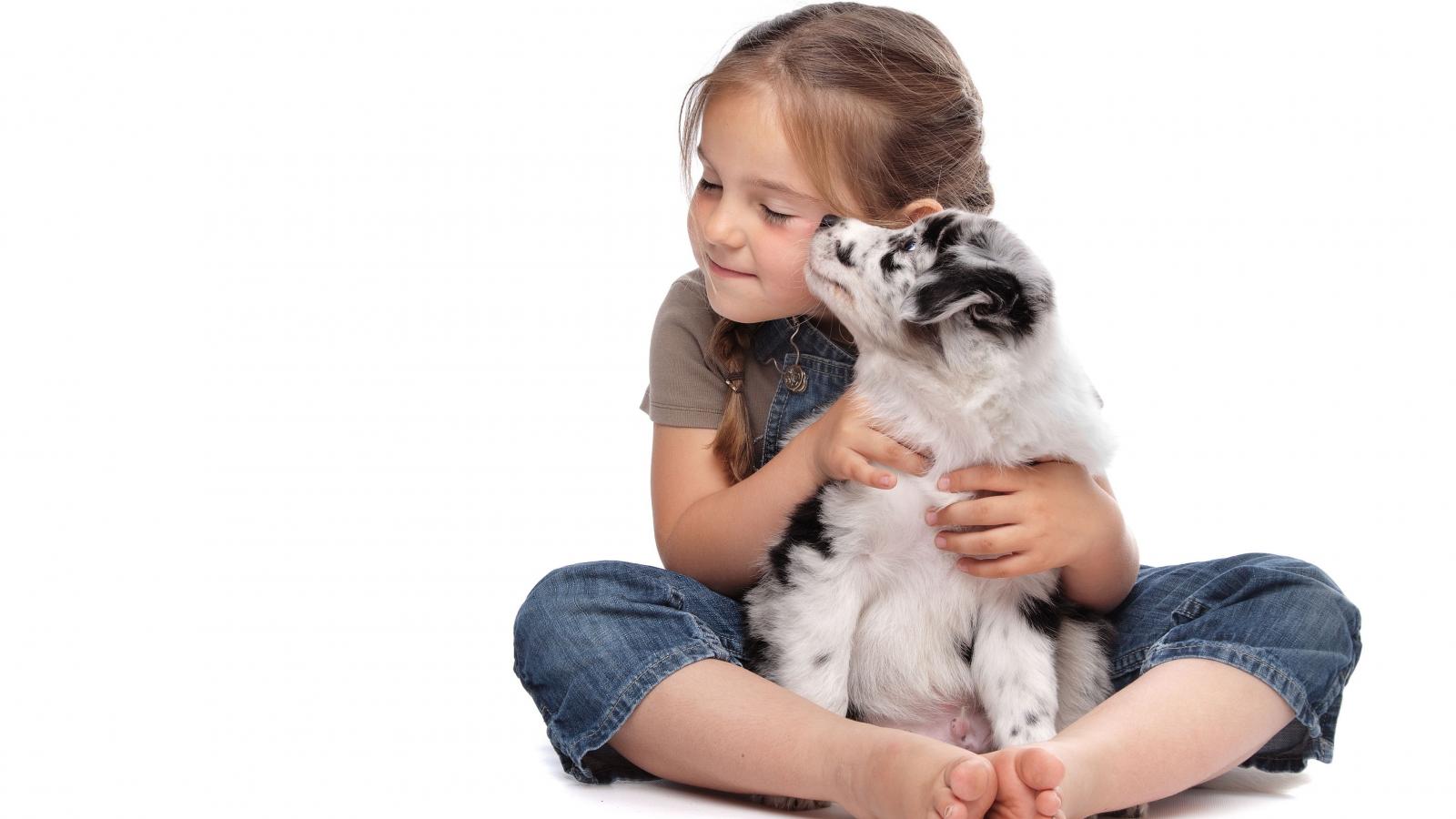Wallpaper Little girl hugs a puppy on a white background