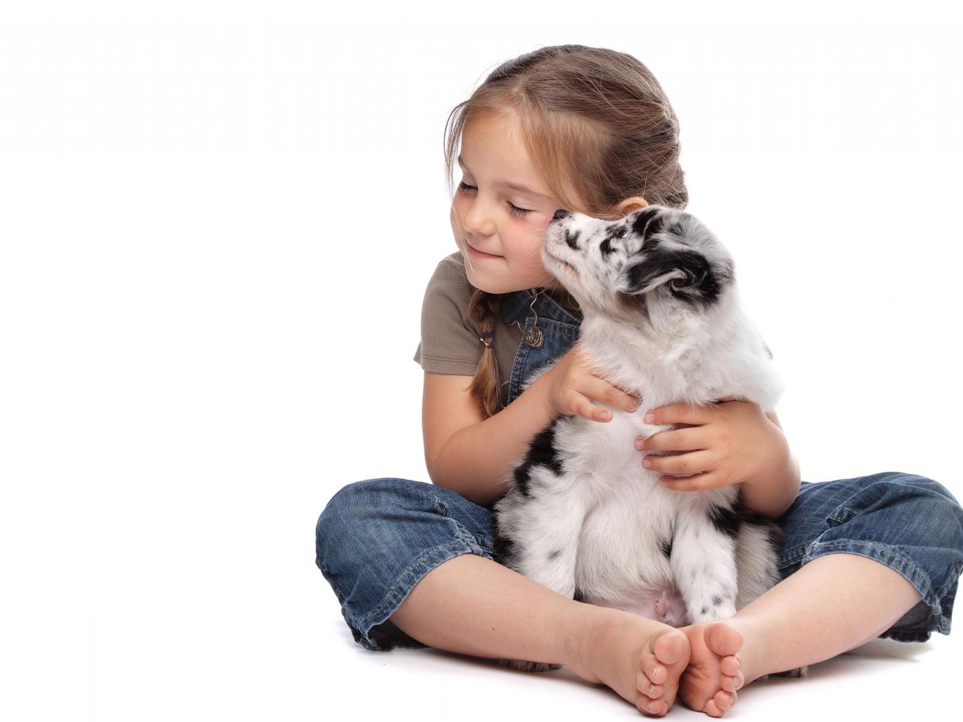 Wallpaper Little girl hugs a puppy on a white background
