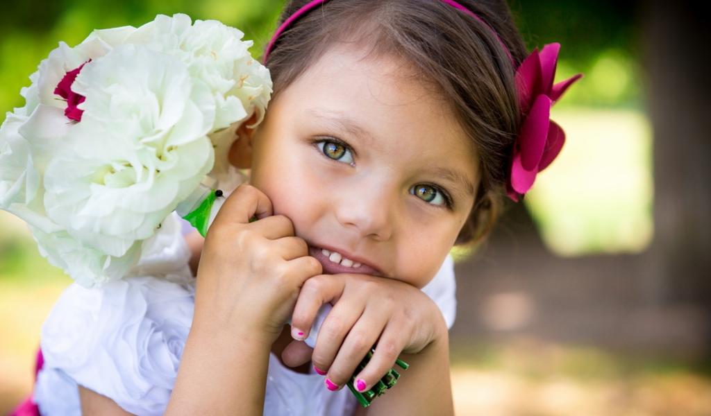 Wallpaper Little girl with a bouquet of white flowers in hands