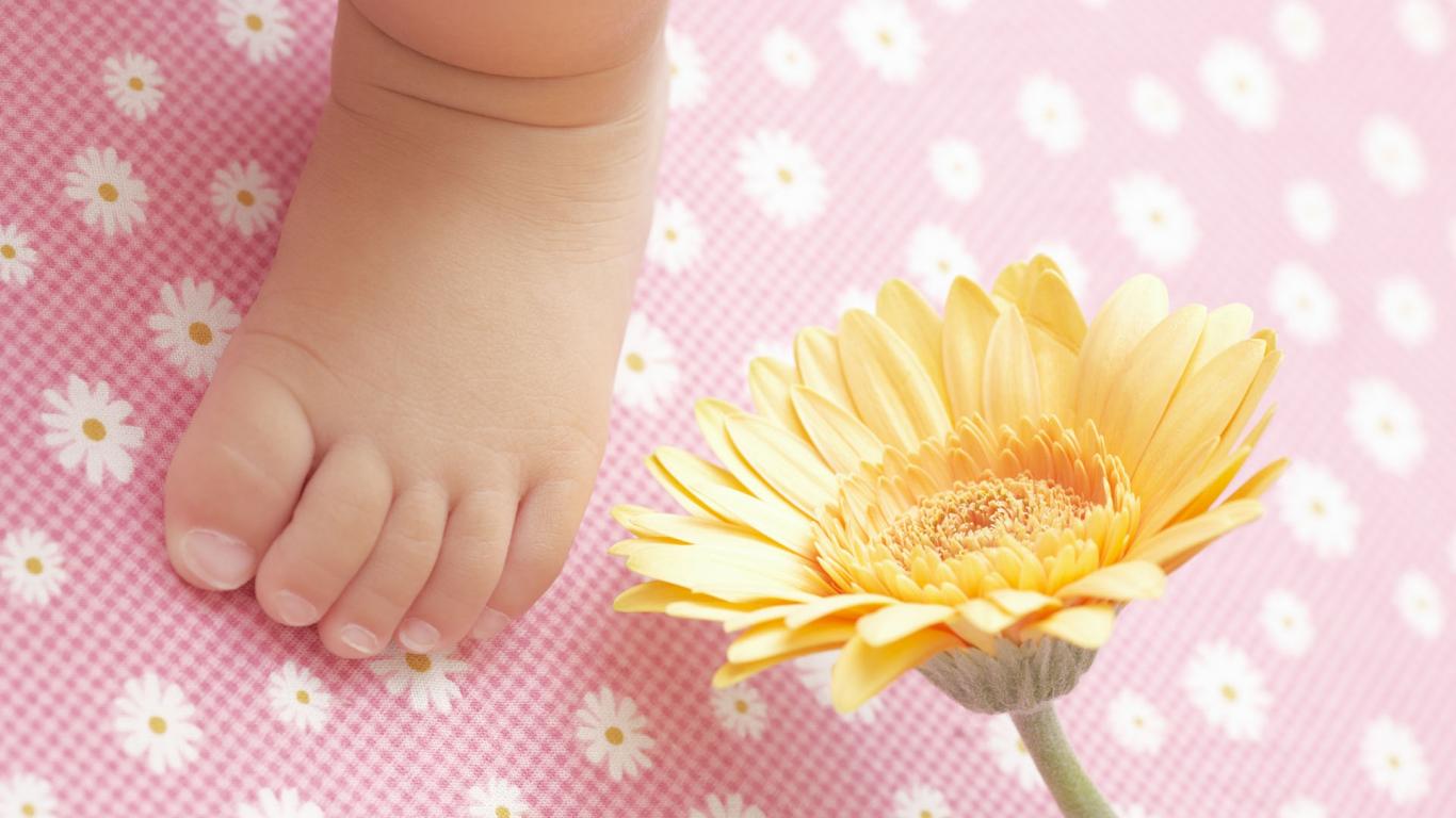 Wallpaper A small newborn leg with a gerbera flower