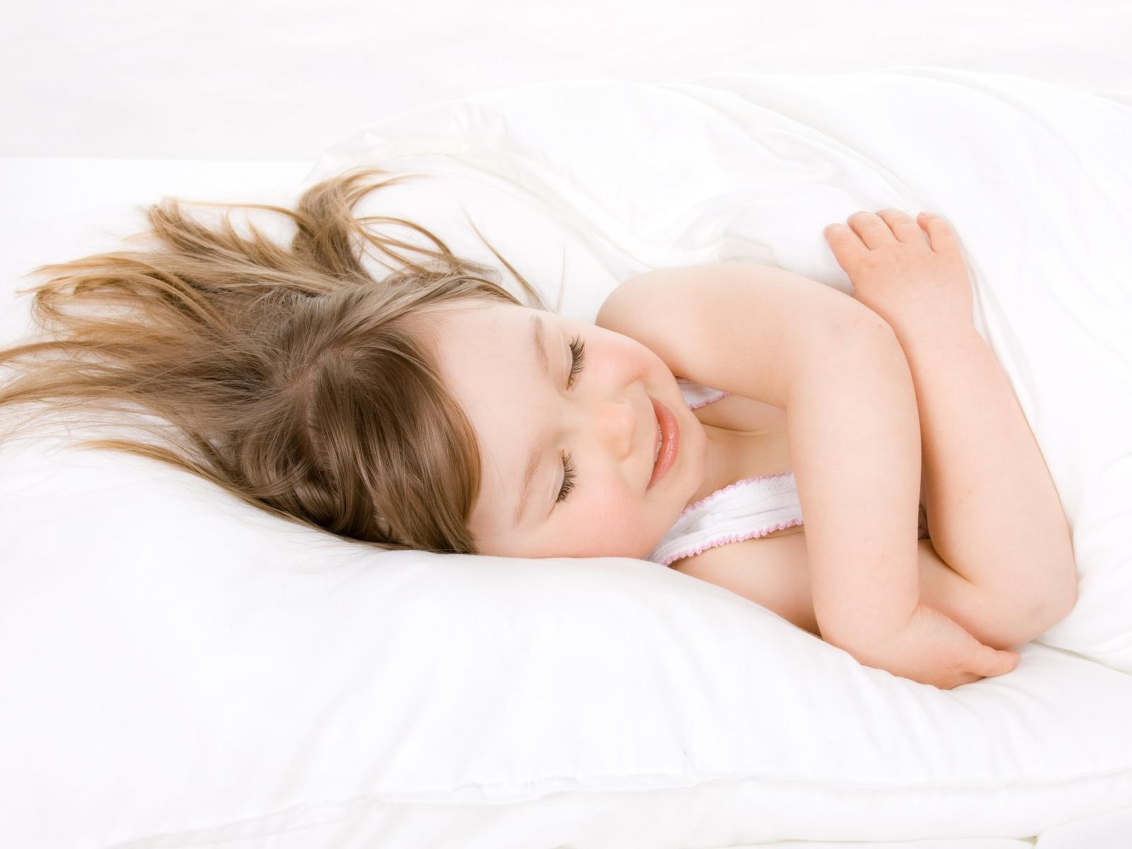 Wallpaper Little girl is sleeping on a white bed