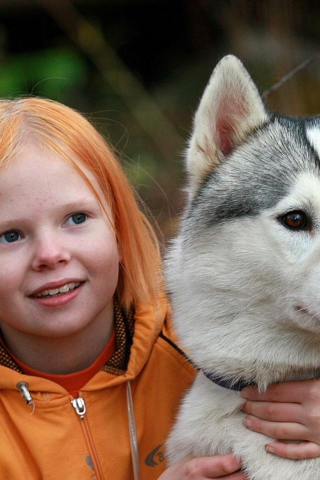 Wallpaper Little Red-haired Girl With Husky Dog