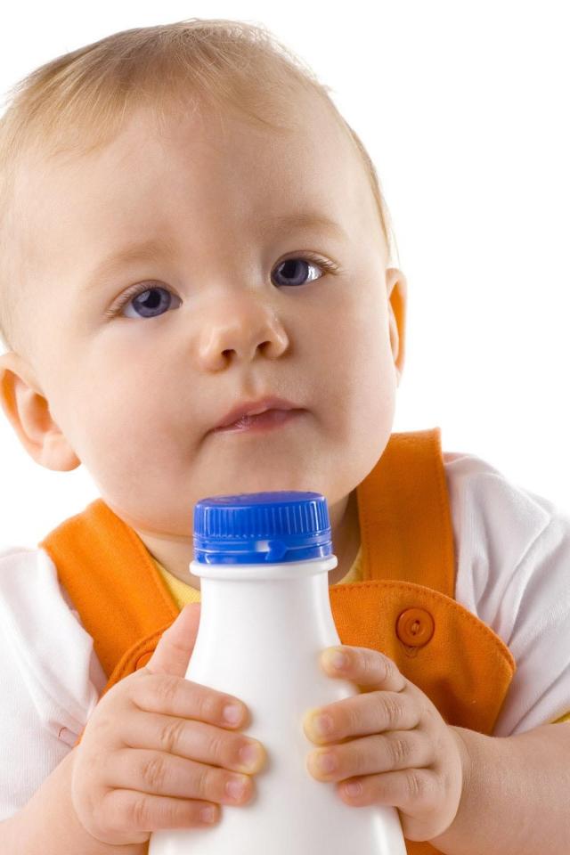 Wallpaper Little boy with a bottle of milk on a white background