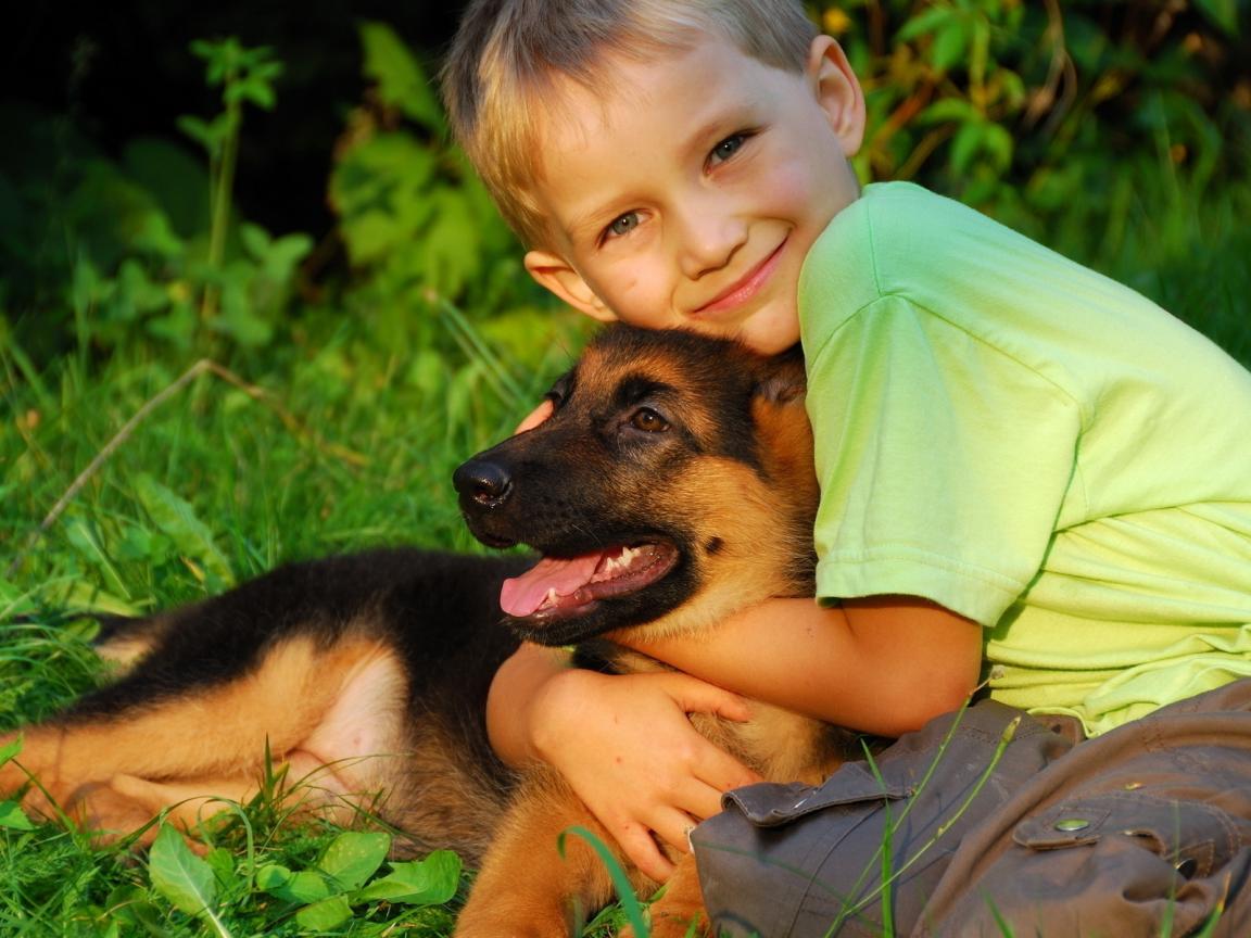Wallpaper Little boy hugging a German Shepherd puppy