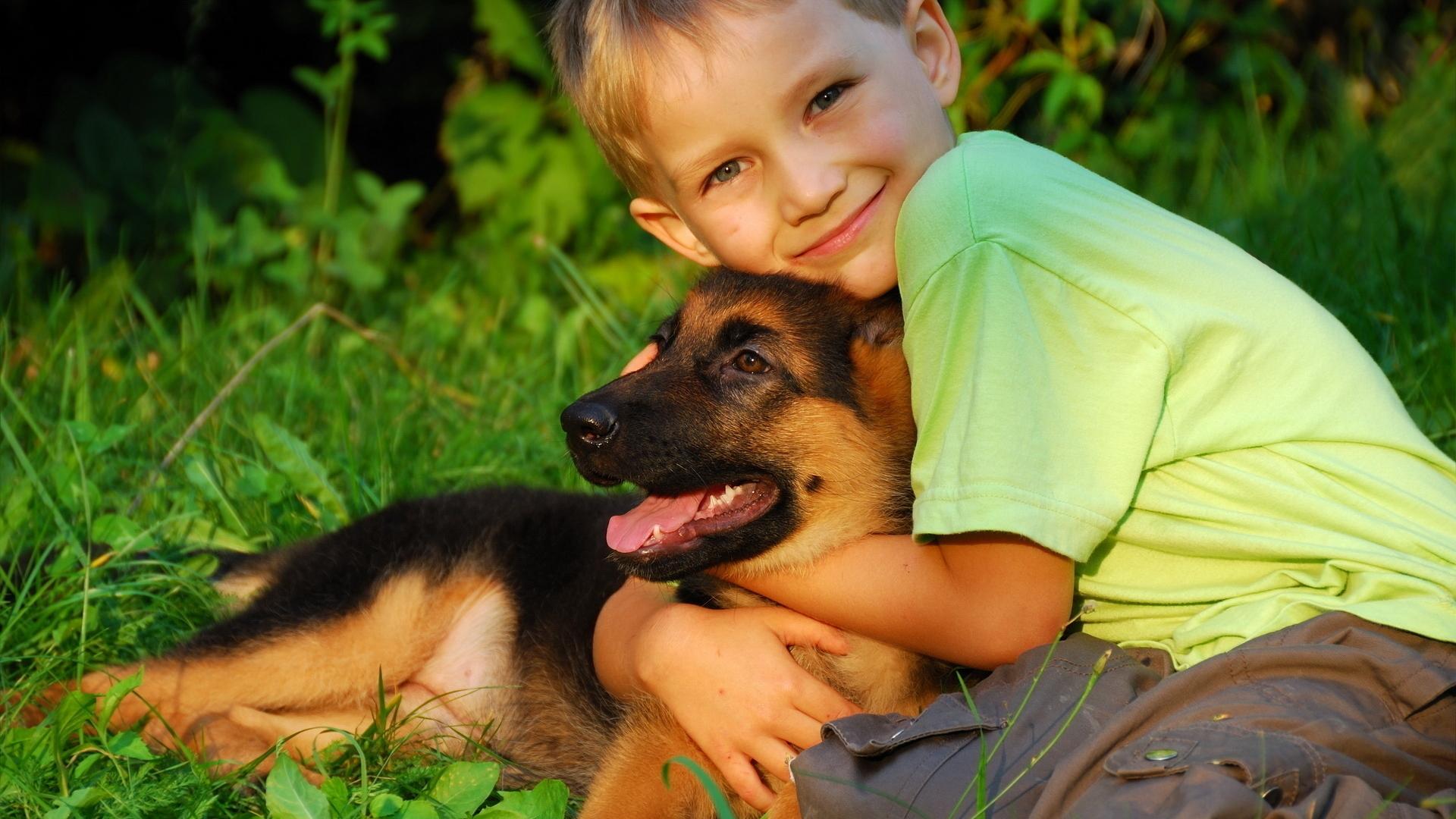 Wallpaper Little boy hugging a German Shepherd puppy