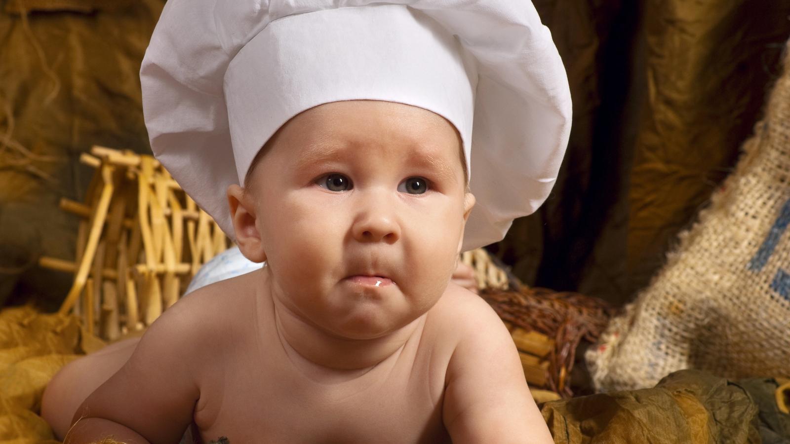 Wallpaper A baby child in a chef`s hat sits in a large saucepan