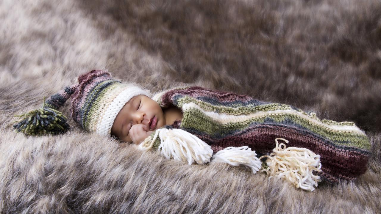Wallpaper The baby in a knitted hat sleeps with a toy under a fur blanket