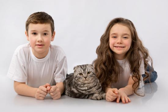 Wallpaper Boy and girl with a Scottish cat on a gray background