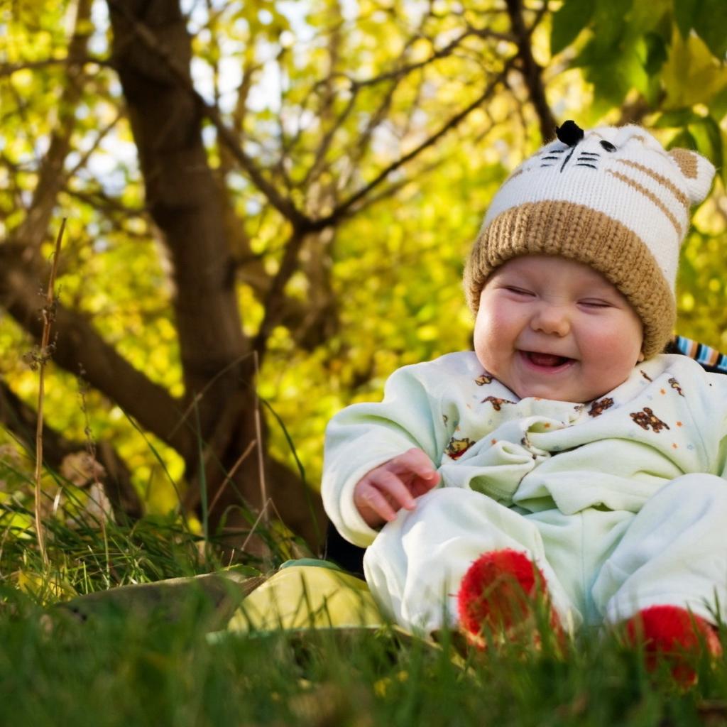 Wallpaper A laughing baby is sitting on the grass