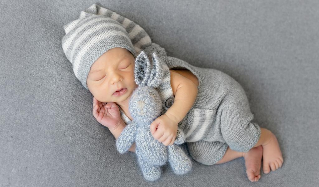 Wallpaper A sleeping baby with a gray knitted hare