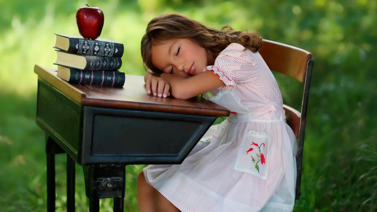 Wallpaper The tired little schoolgirl fell asleep at the desk