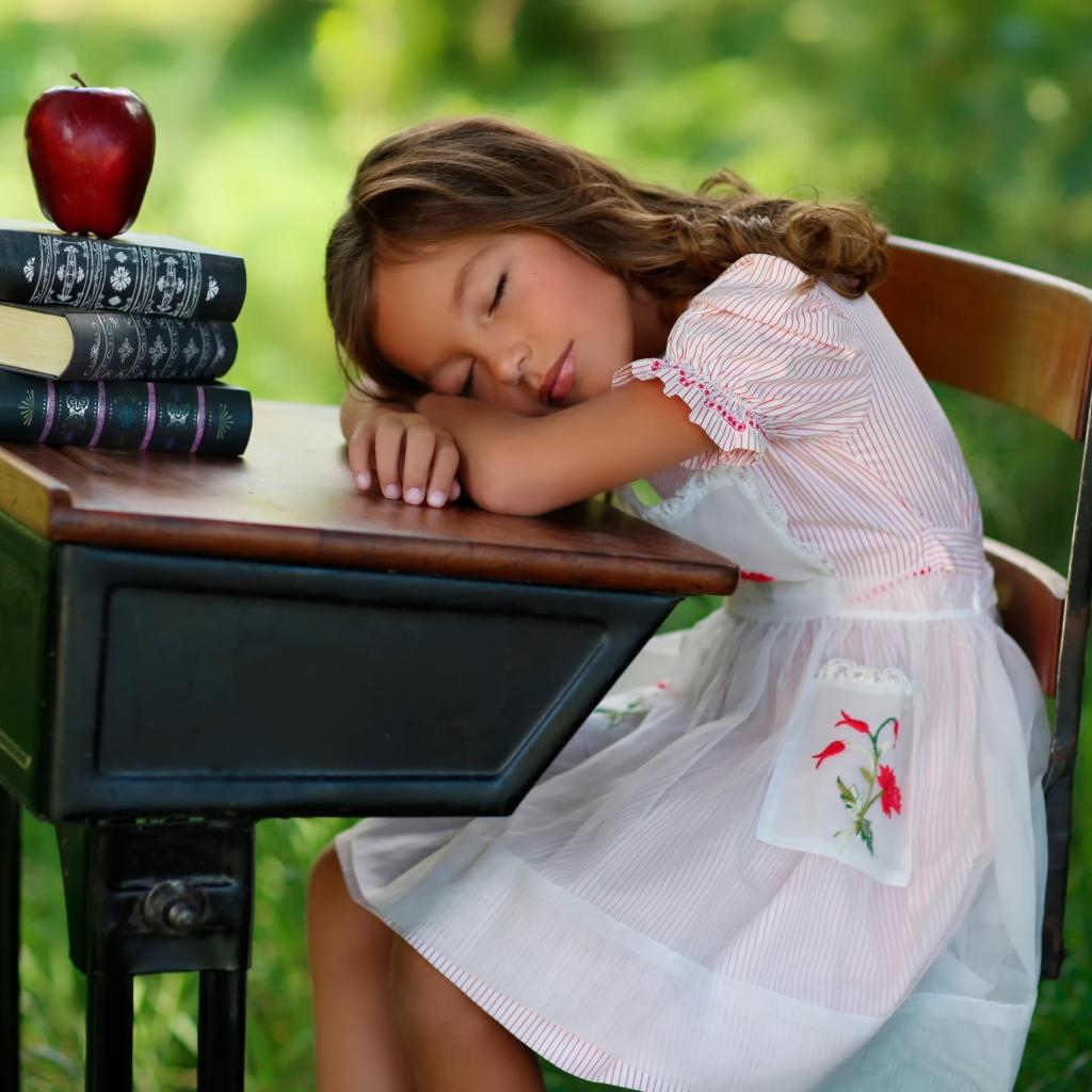 Wallpaper The tired little schoolgirl fell asleep at the desk