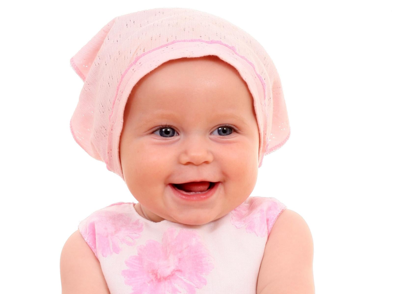 Wallpaper Smiling baby in pink hat on white background