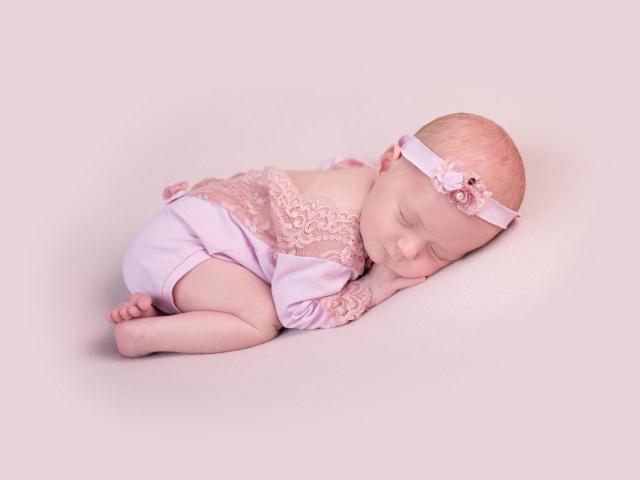 Wallpaper Sleeping baby in a pink knitted suit in the cradle