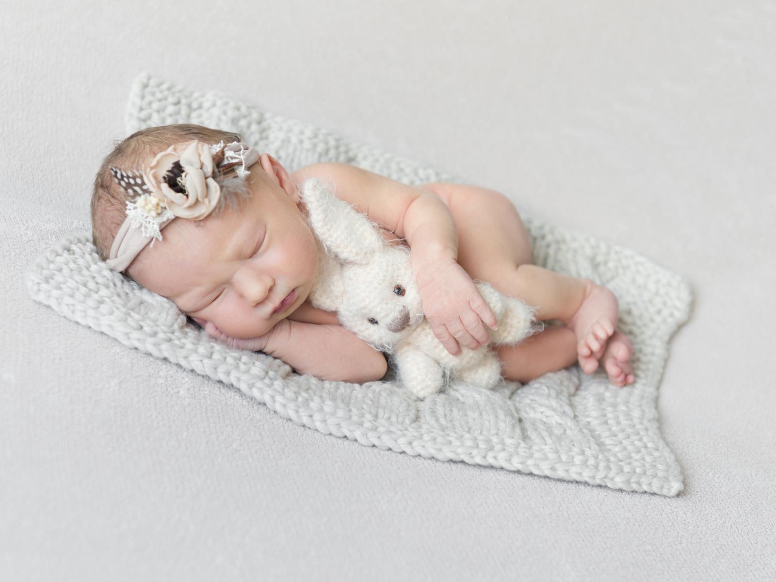 Wallpaper Sleeping baby with a toy on a gray background