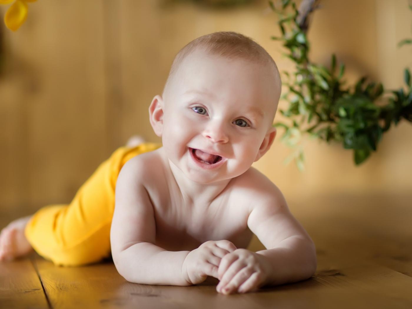 Wallpaper A smiling baby lies on the wooden floor