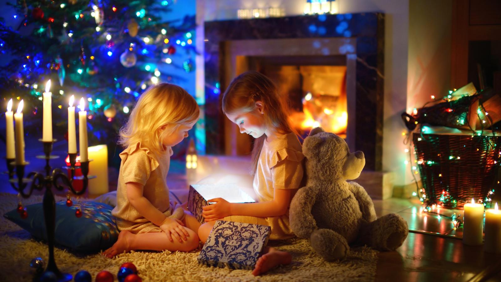 Wallpaper Two little girls with toys by the fireplace