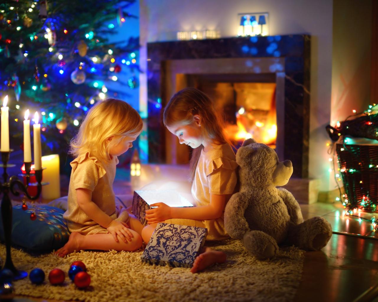 Wallpaper Two little girls with toys by the fireplace