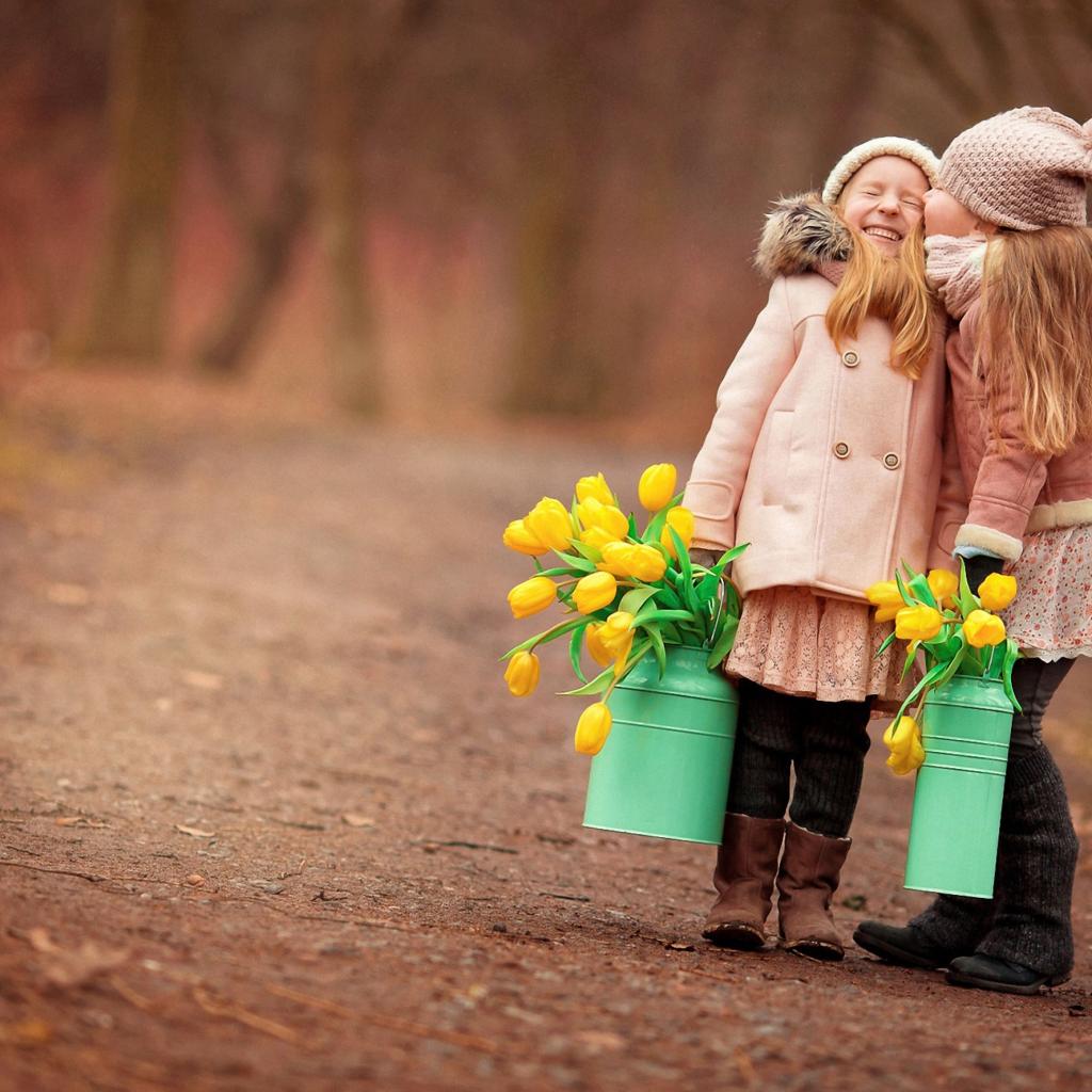 Wallpaper Two little girls with yellow tulips in the spring