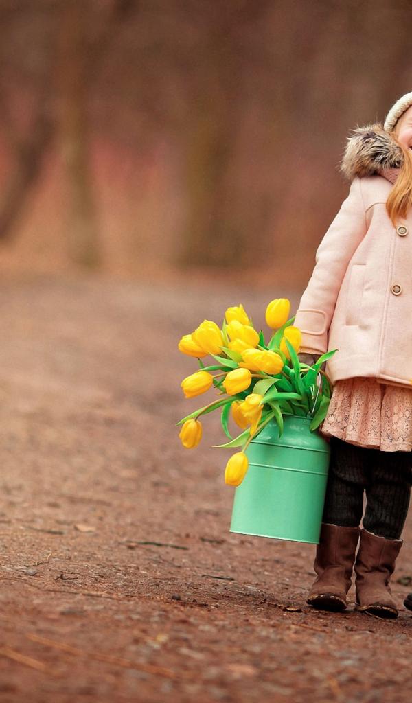 Wallpaper Two little girls with yellow tulips in the spring