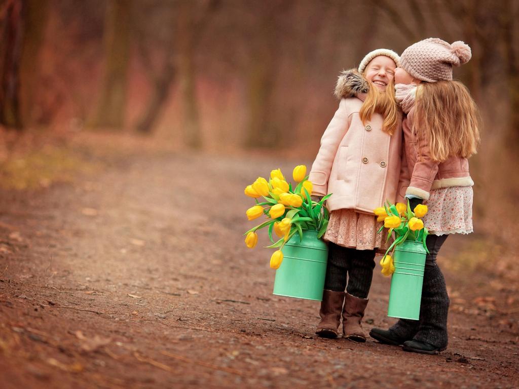 Wallpaper Two little girls with yellow tulips in the spring