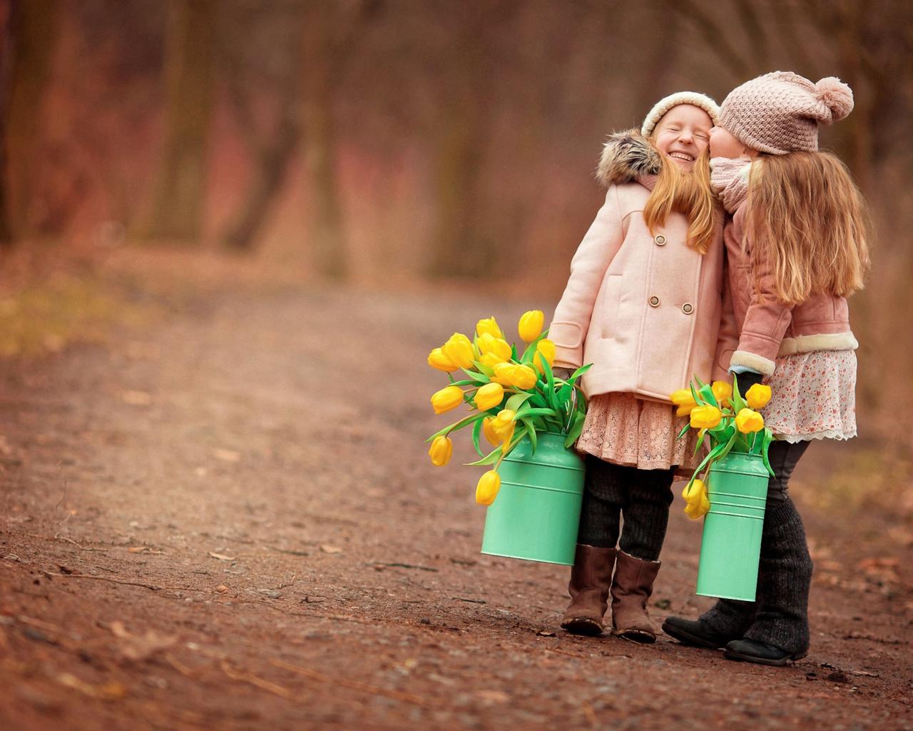 Wallpaper Two little girls with yellow tulips in the spring