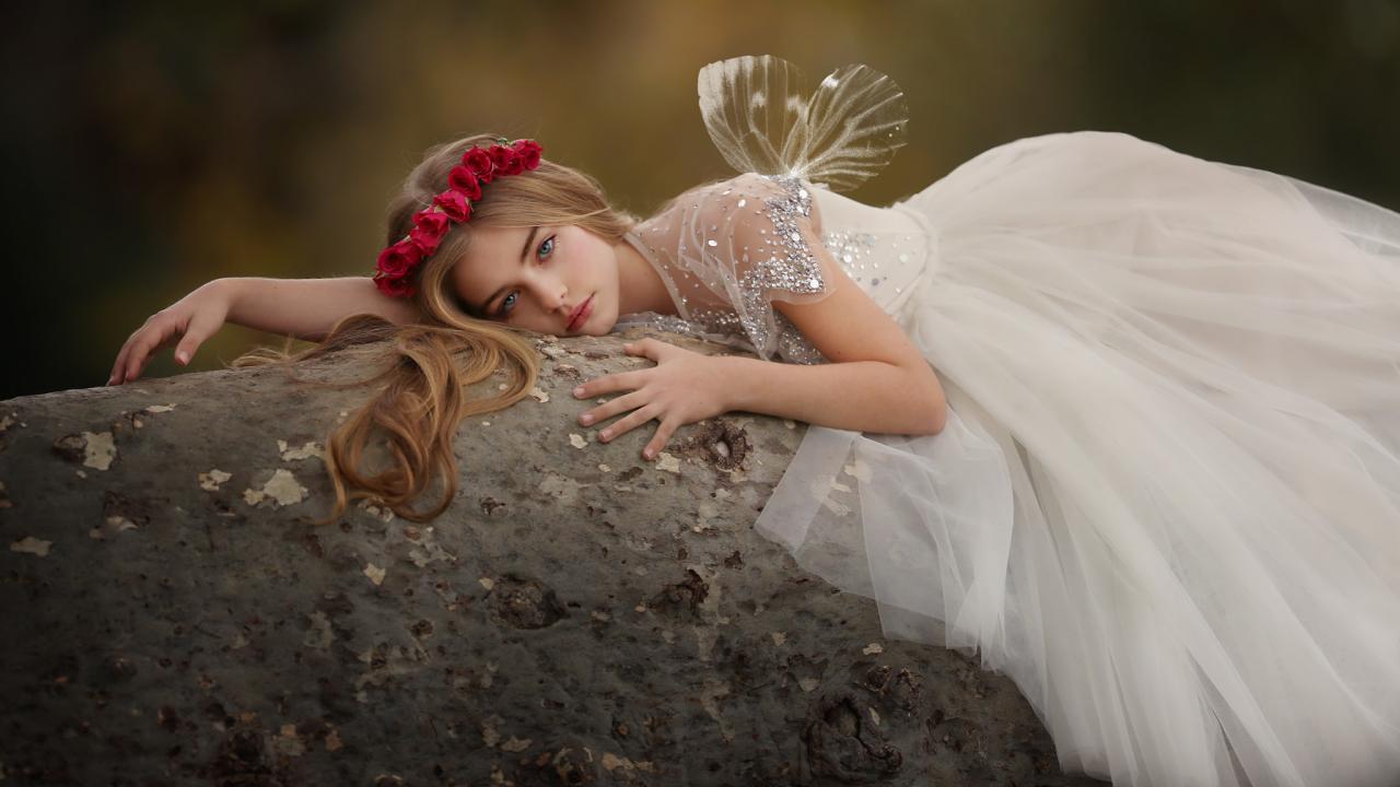 Wallpaper Beautiful little girl in a white dress lies on a stone